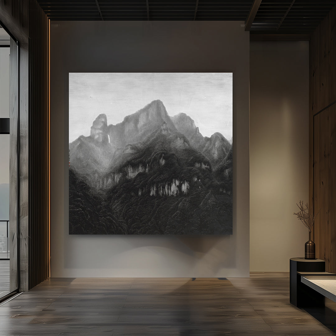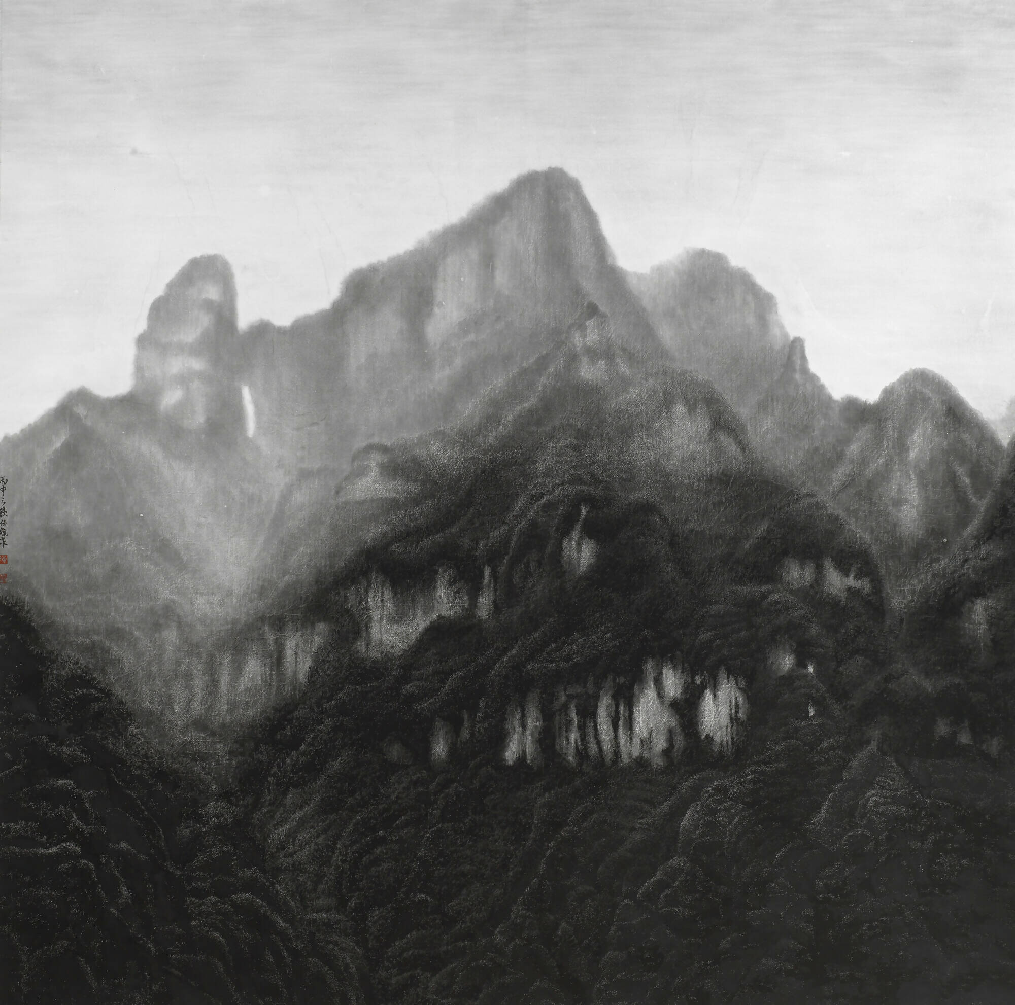 On a striking 180cm-by-180cm Xuan paper canvas, towering mountains emerge from a deep ink-black background, shrouded in mist and clouds in this piece called "Unbroken Cliffs." To capture the mountains' grandeur, the artist intensifies ink tonality contrasts between the foreground, midground, and background; this treatment creates a sense of spatial movement, giving the impression of expansive mountains and flowing mist. Meticulously executed layers of rock and vegetation, achieved through countless repetitive brush strokes, convey the mountains' grandeur and evoke the swirling mountain air.