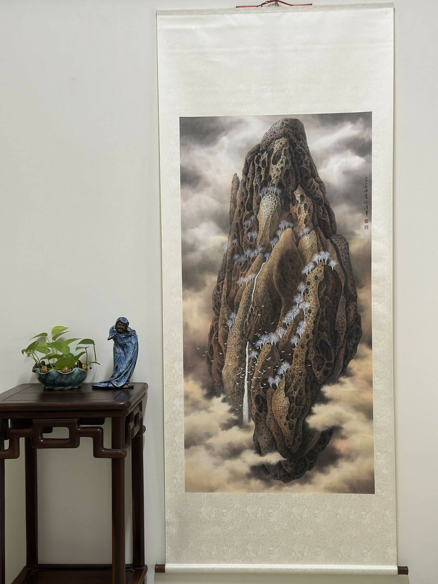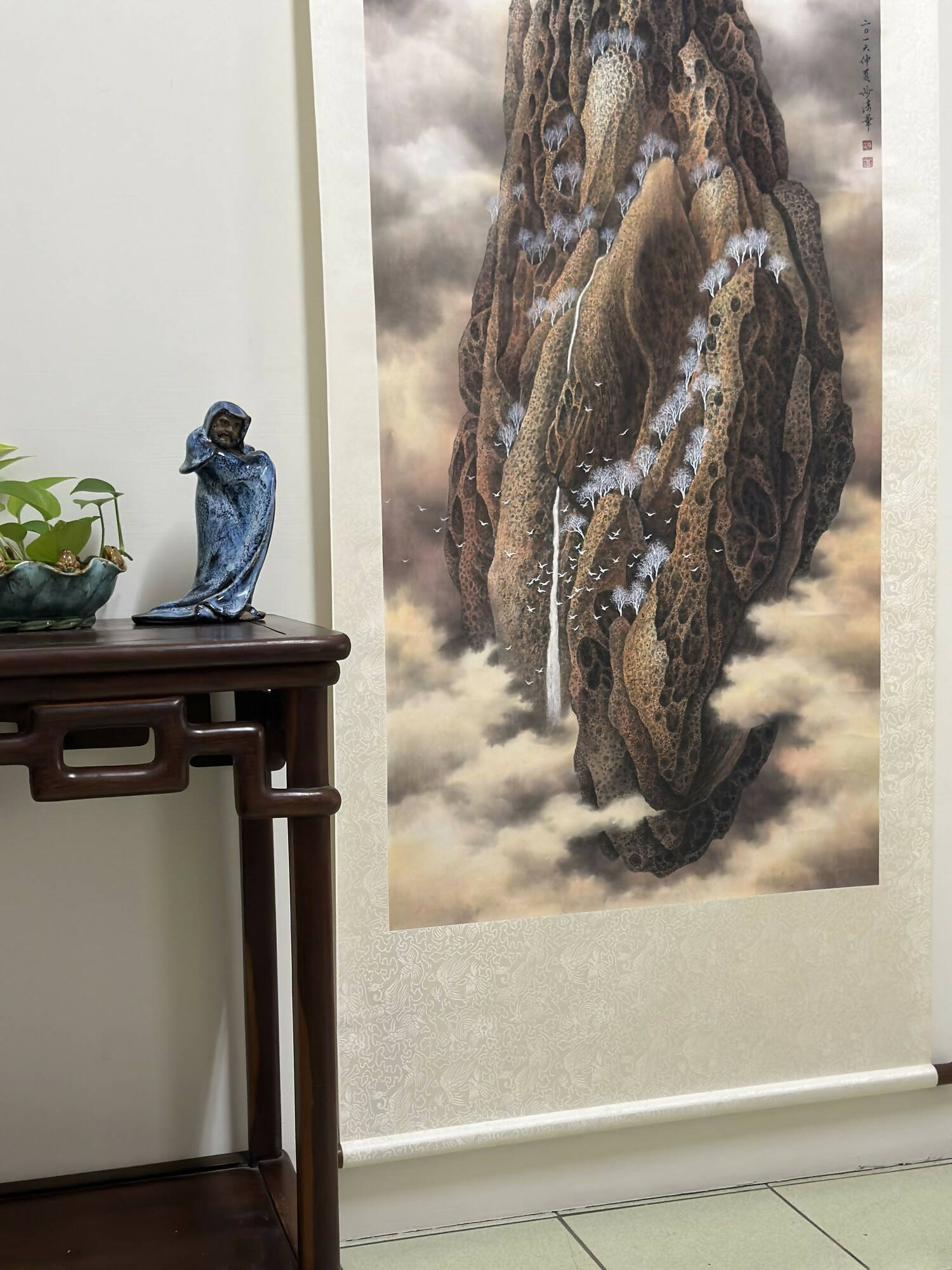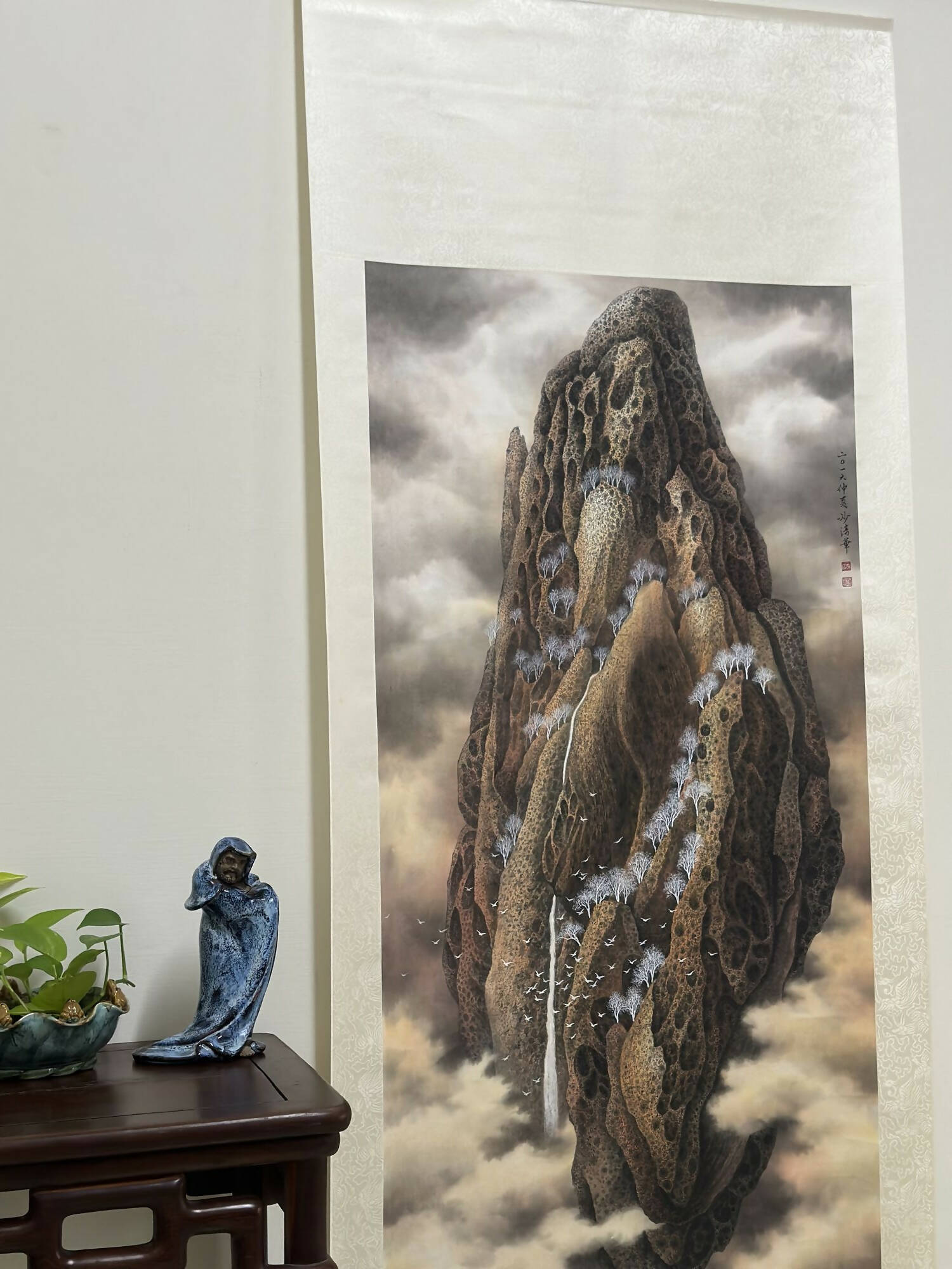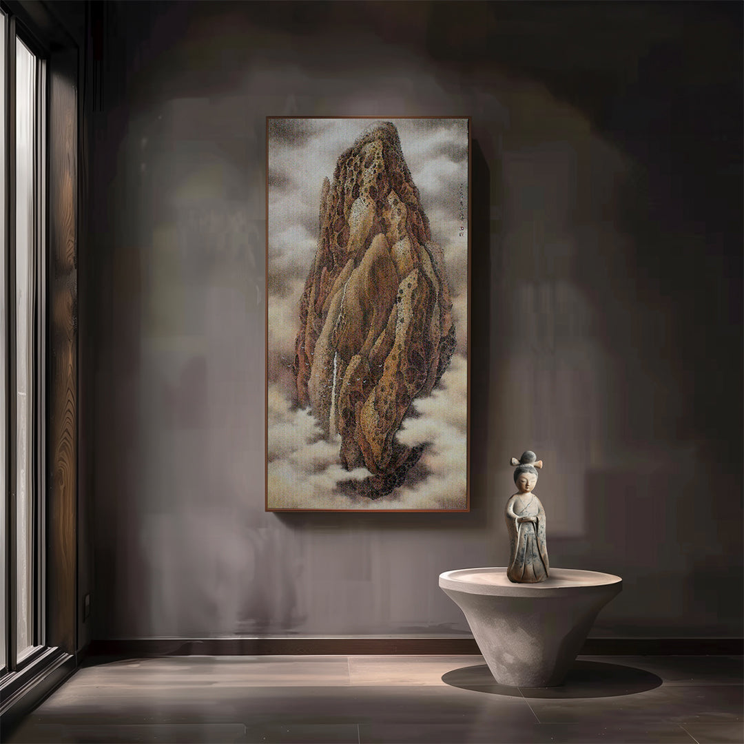 In this painting, a monolithic rock mysteriously hovers amid a canvas of mist-laden clouds. With birds weaving patterns at its base, this centerpiece projects a palpable sense of age, mystery, and transcendence.