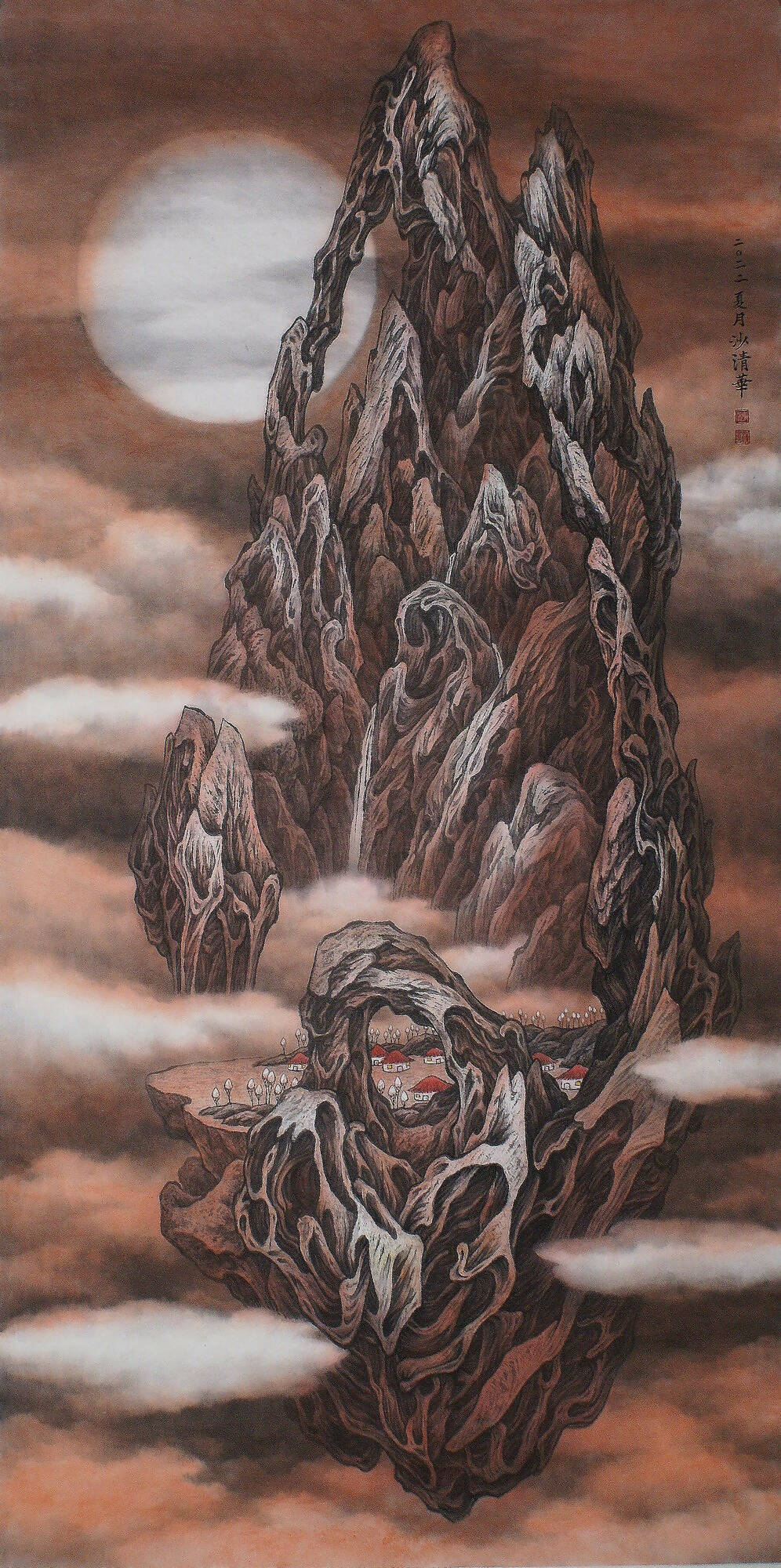 Illuminated by the moon's soft glow, the artwork radiates an air of serene mystery. Nestled within the mountain's crevices, a hidden village emerges, sparking the viewer's imagination and transporting them into a dreamlike realm.