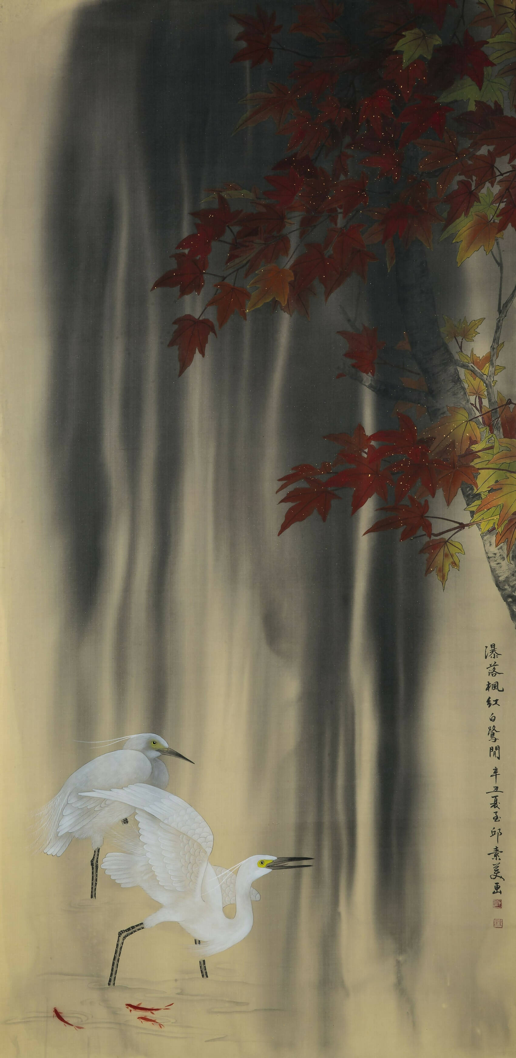 In this piece, the artist captures the vivid interplay between a cascading waterfall and clusters of red maple trees. The painting is dramatically rendered in a striking black, white, and red palette, masterfully depicting flowing water, swaying leaves, and soaring egrets. The result is a visually arresting composition that showcases the artist's expertise in precise lines and the nuanced interplay between colour and monotone.