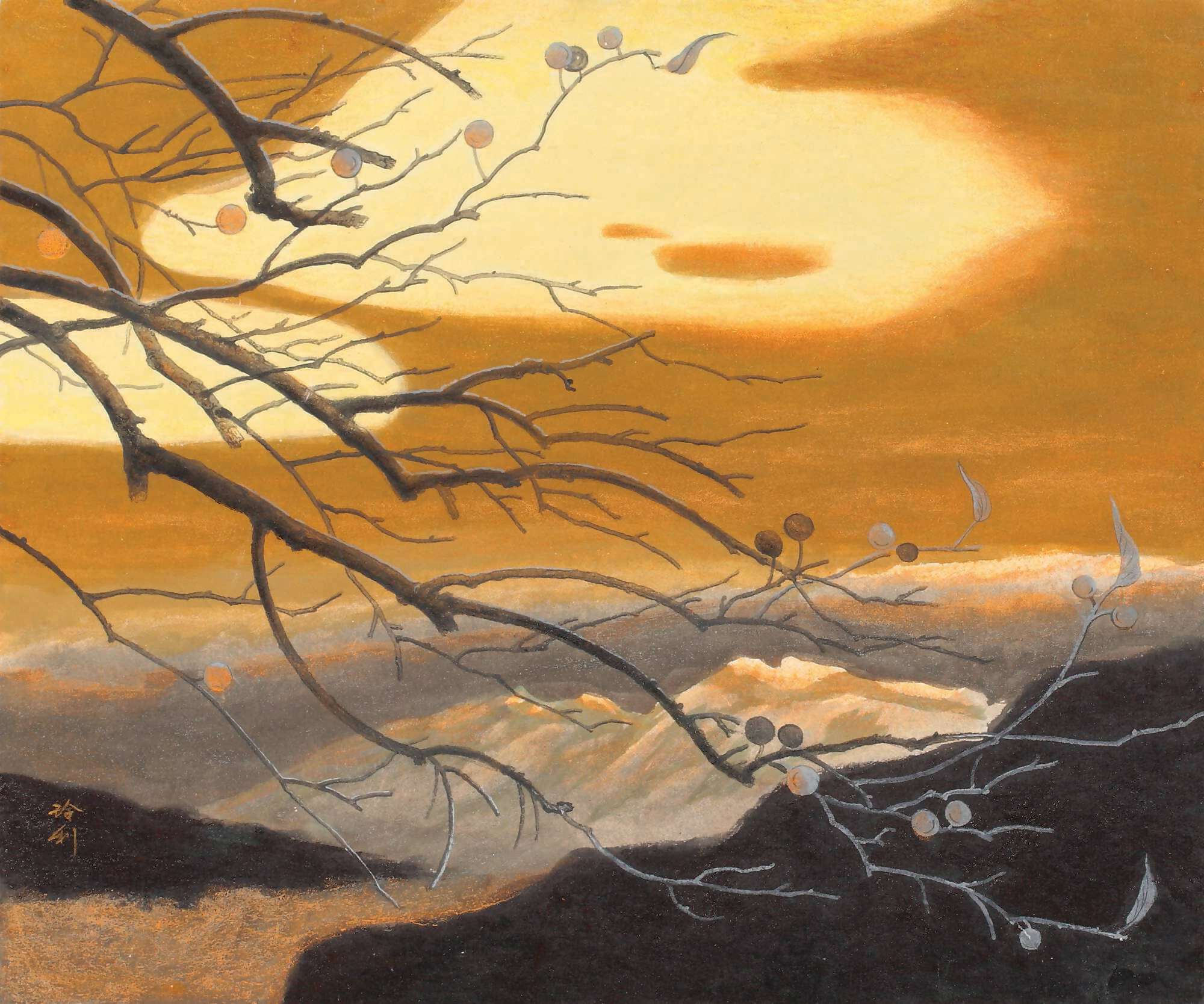 The composition is unexpectedly asymmetric, using a branch of a deciduous tree as the focal point. In the distance, mountains and forests emerge, framed by the twisted branches adorned with buds destined to burst into a riot of vibrant blossoms.